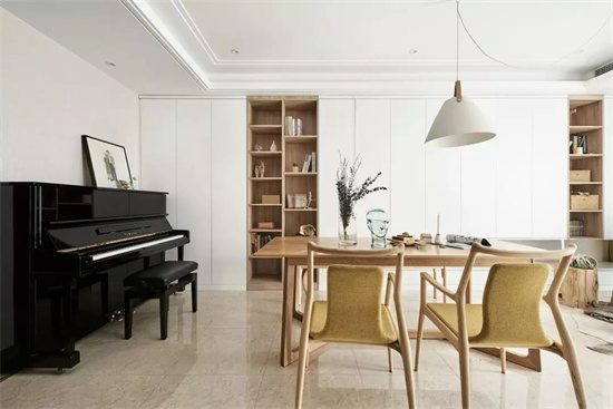 打破客厅和餐厅固有的格局,将客餐厅打造成一个集学习、娱乐、用餐、活动于一体的区域。在这样一个多功能的空间里,对储藏的要求是较高的,于是设计师沿着餐厅的一整面墙做了一套展示兼储藏的柜子,中间设置书柜,方便寻找资料。